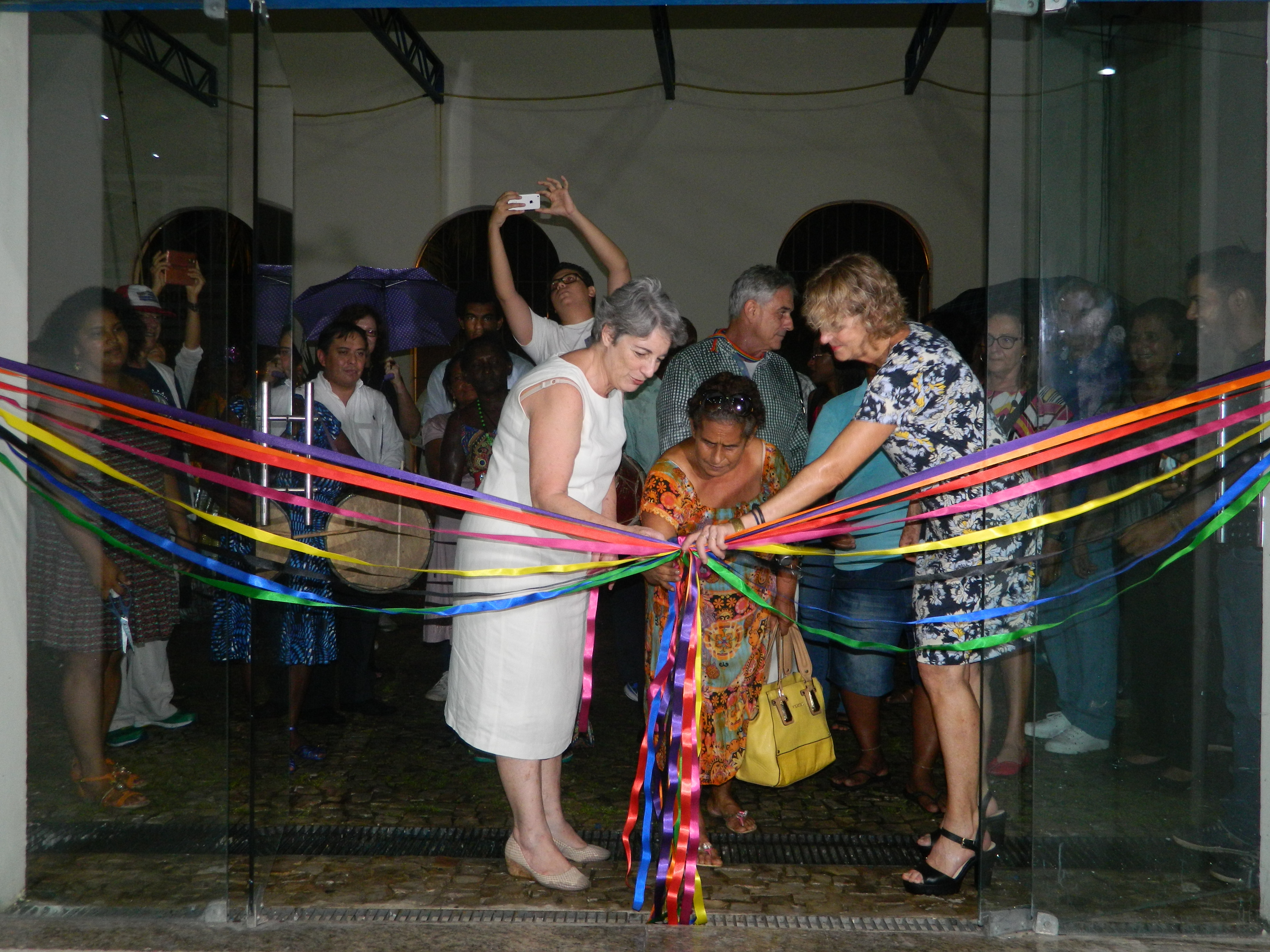 A professora Heloisa Bertol e a quebradeira de Coco, Querubina Silva, cortam a fita de inauguração da Exposição