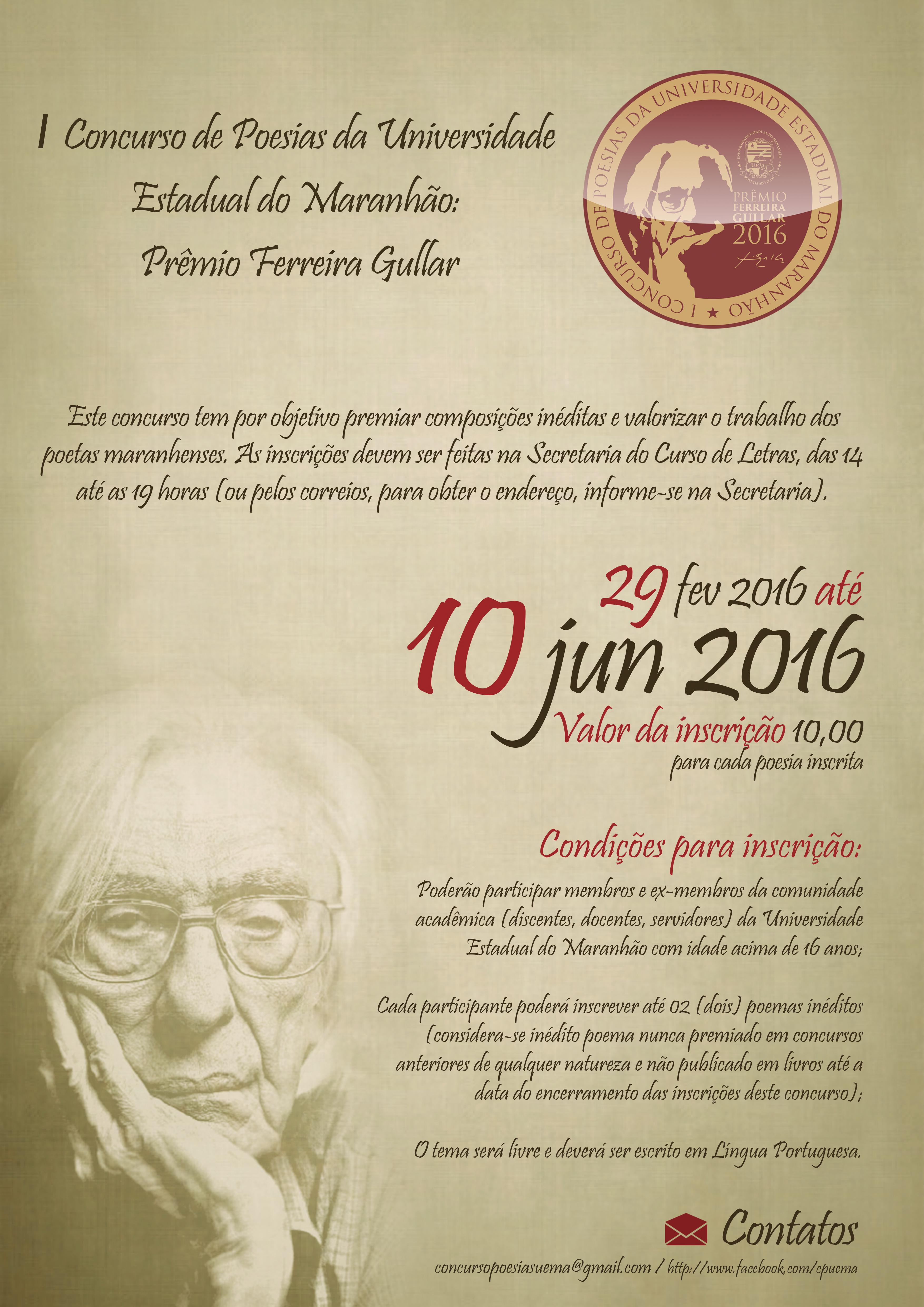 O I Concurso de Poesias: Prêmio Ferreira Gullar busca nomear, premiar e valorizar o trabalho de poetas maranhenses que ainda não foram publicados. O público alvo compreende os discentes e egressos, docentes e servidores da UEMA.