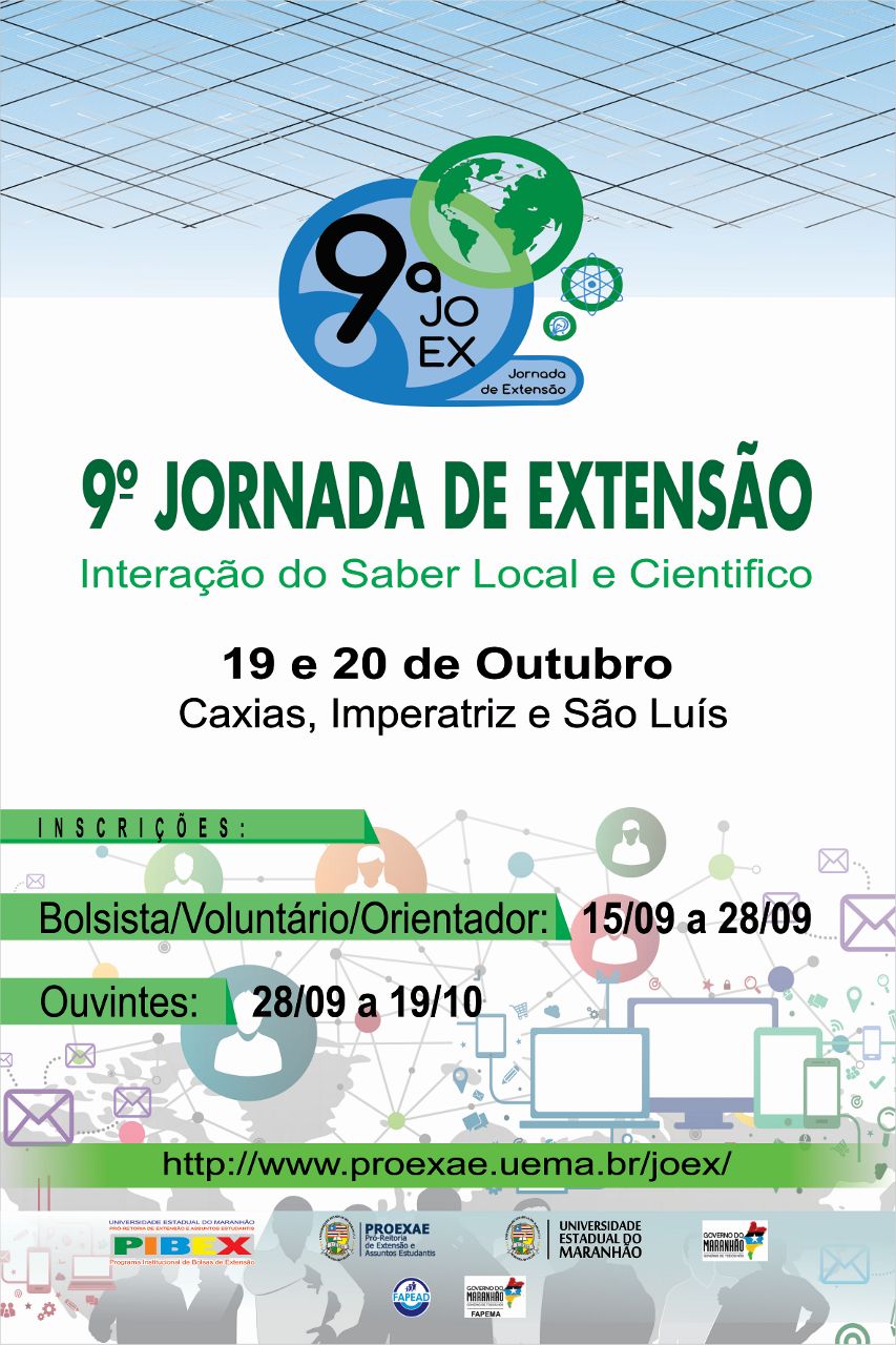 A Universidade Estadual do Maranhão, por meio da Pró-Reitoria de Extensão e Assuntos Estudantis (Proexae) informa que estão abertas as inscrições para 9ª Jornada de Extensão Universitária – JOEX. Com o tema “Interação do saber local e científico”, o evento será realizado nos dias 19 e 20 de outubro, em São Luís, Caxias e Imperatriz.