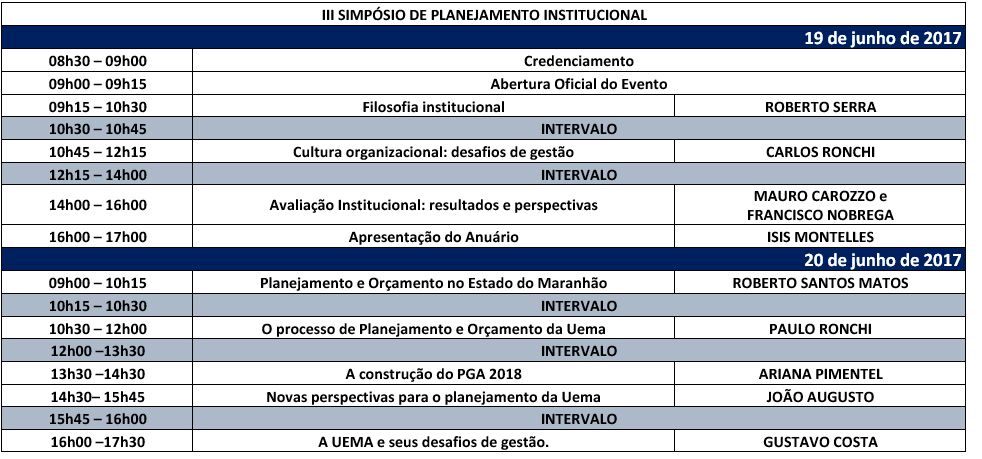 Com o tema “Gestão Estratégica Alinhada ao PDI”, a Universidade Estadual do Maranhão (UEMA), por meio da Pró-Reitoria de Planejamento (PROPLAN), realizou entre os dias 19 e 20 de junho, no auditório da Faculdade de Arquitetura e Urbanismo, o III Simpósio de Planejamento Institucional.