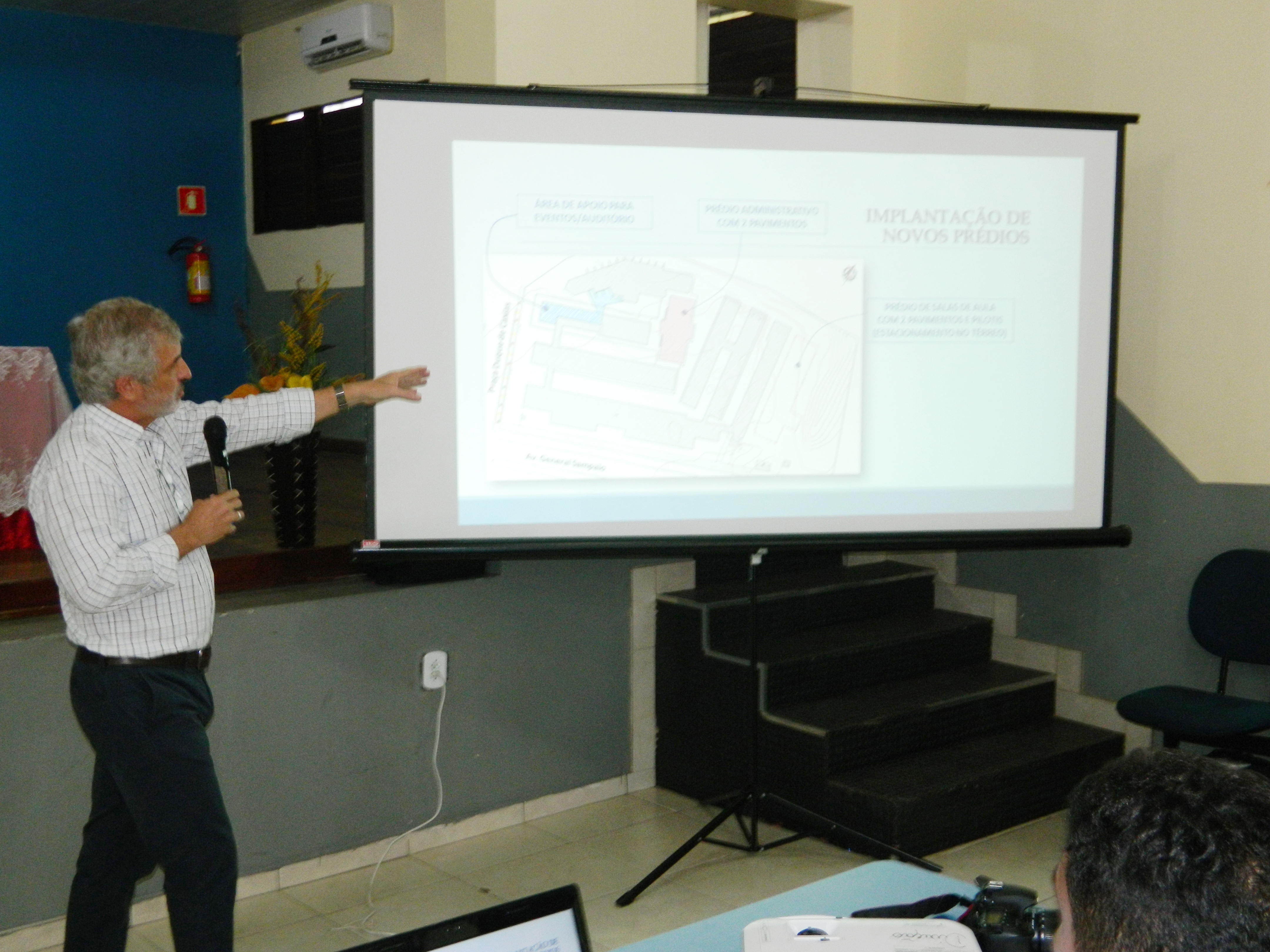 Na ocasião, o reitor Gustavo Pereira da Costa, acompanhado da diretora do Centro, Valéria Pinheiro, assinou as ordens de serviços da obra do novo Herbário e da liberação de vagas para concursos de professores. E, continuando com as ações, o vice-reitor Walter Canales fez a apresentação do projeto do novo prédio administrativo do CESC, que terá uma nova fachada e outras melhorias.