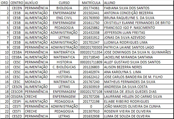 A Pró-Reitoria de Extensão e Assuntos Estudantis (PROEXAE) da Universidade Estadual do Maranhão (UEMA), por meio da Coordenação de Assistência Estudantil, comunica aos diretores de curso que os dados bancários dos alunos contemplados com os auxílios da Assistência Estudantil, abaixo relacionados, estão pendentes.