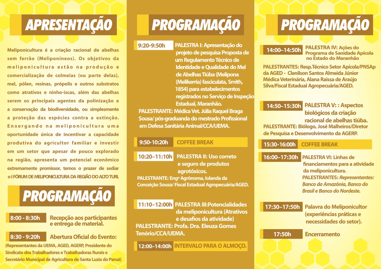 Serão abordados assuntos como: o uso correto e seguro de produtos agrotóxicos, linhas de financiamentos para a atividade da meliponicultura, proteção de espécie contra extinção entre outras coisas. Confira a programação completa:
