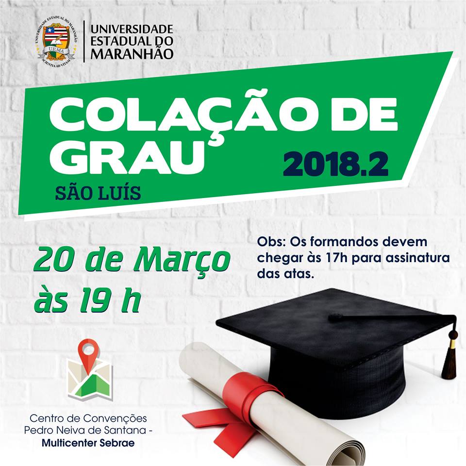 colação de grauConsiderando o incidente ocorrido no Ginásio Castelinho, a Assessoria de Cerimonial e Eventos da Universidade Estadual do Maranhão (ASCEV/UEMA) comunica que a Colação de Grau 2018.2 acontecerá no Centro de Convenções Pedro Neiva de Santana – Multicenter Sebrae, na mesma data e horário marcados anteriormente (20/03).