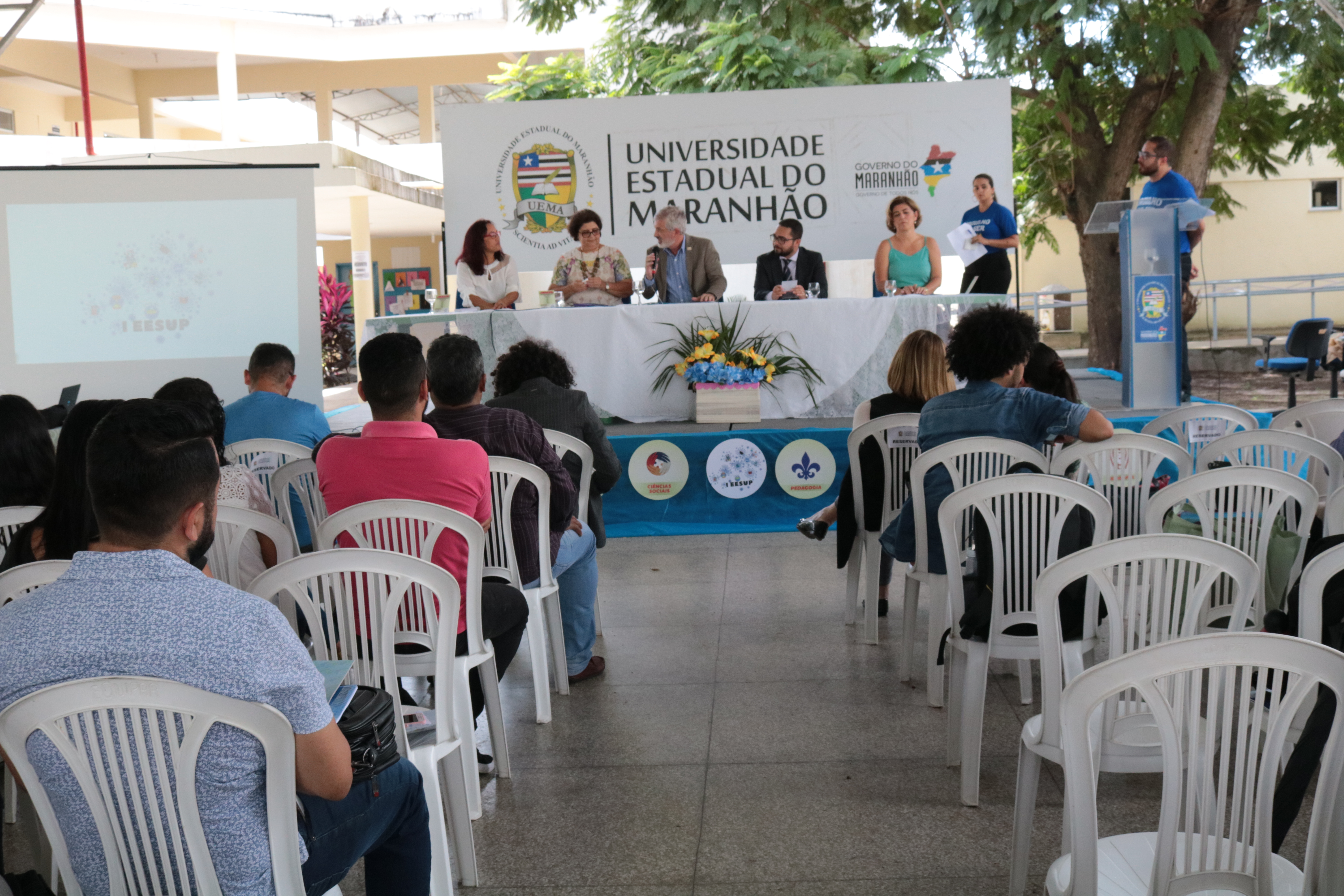 A abertura do evento contou com a participação do vice-reitor, Walter Canales Sant’Ana; do reitor do Instituto Estadual de Educação, Ciência e Tecnologia do Maranhão (IEMA), Jhonatan Almada, da diretora do Centro de Educação, Ciências Exatas e Naturais (CECEN), Maria Gorethi Cavalcante; da coordenadora geral do evento, Albiane Oliveira Gomes; da professora Ana Lúcia Duarte; além de coordenadores de estágio e acadêmicos.