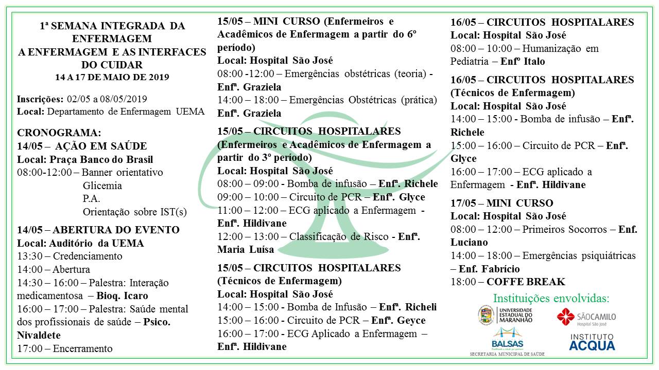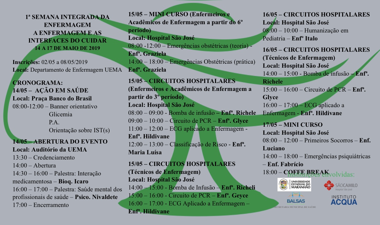 O Campus Balsas, da Universidade Estadual do Maranhão, realiza, de 14 a 17 de maio, a 1ª Semana Integrada da Enfermagem, em parceria com Hospital Regional de Balsas, Hospital São José, Secretaria Municipal de Saúde, Clinica Alicia Rodrigues e Farmácia Popular. O evento traz o tema “A Enfermagem e as Interfaces do cuidar”.
