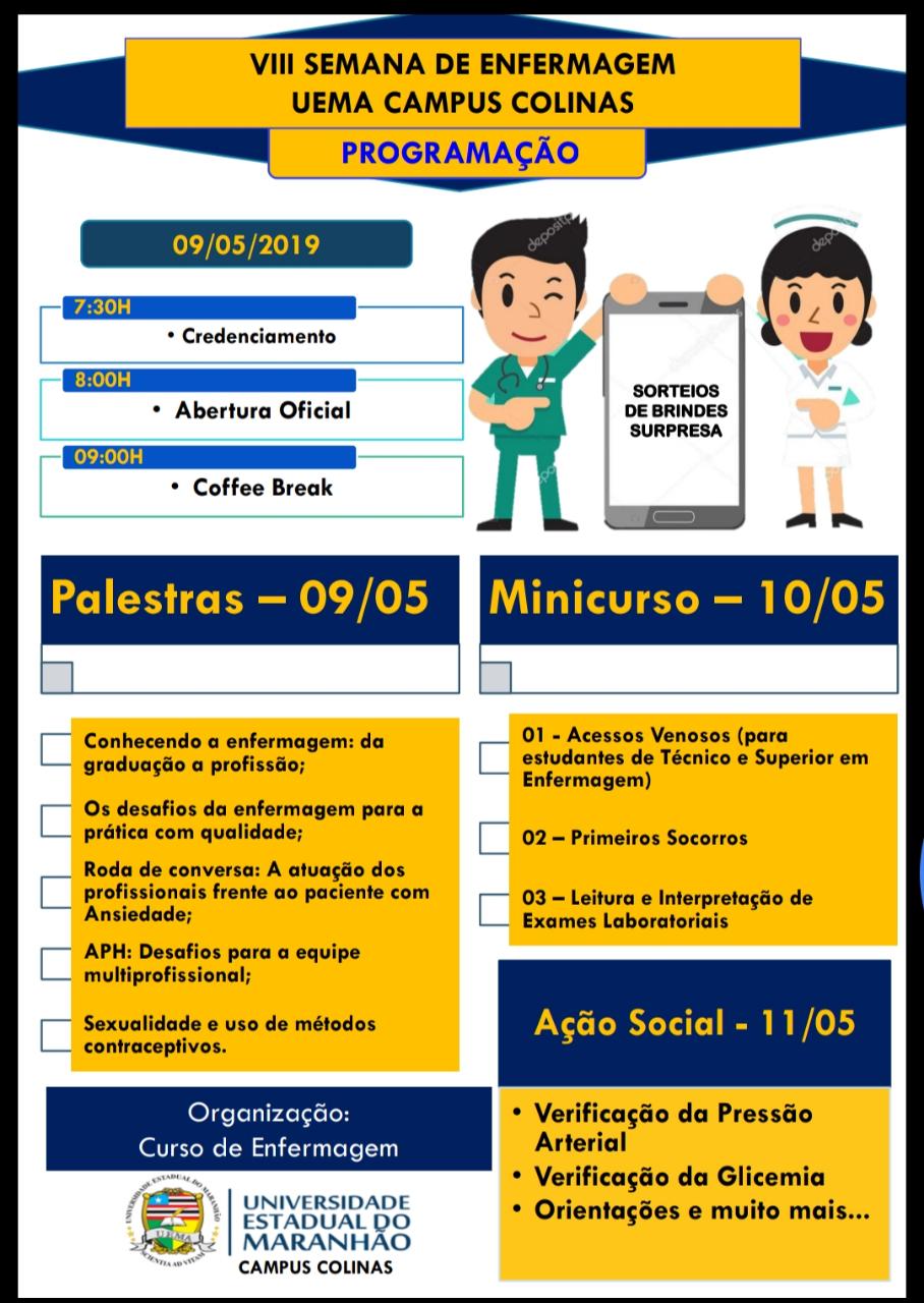 O Campus Colinas UEMA realiza, de 09 a 11 de maio, a VII Semana de Enfermagem. O objetivo é aproximar e apresentar à população colinense o trabalho realizado pelos acadêmicos do curso de Enfermagem, além de desenvolver atividades de cunho científico cultural e social.