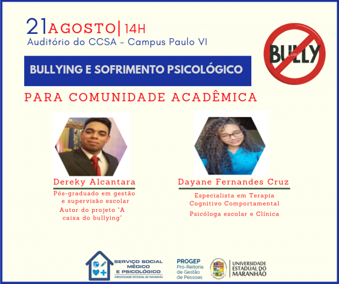 A Pró-Reitoria de Gestão de Pessoas da Universidade Estadual do Maranhão (PROGEP/UEMA), por meio da Coordenadoria de Qualidade de Vida (CQV), promove, dia 21 de agosto, às 14h, no Auditório do CCSA – Campus Paulo VI, a roda de conversa “Bullying e sofrimento psicológico”.