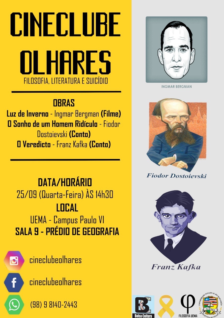 O projeto Cineclube Olhares, do Curso de Filosofia da Universidade Estadual do Maranhão (UEMA), exibirá, nesta quarta (25), o filme “Luz de Inverno”, dirigido por Ingmar Bergman, especial Setembro Amarelo. E em parceria com o Grupo de Estudos sobre Existencialismo, coordenado pelo professor Rafael Pinheiro, além da análise e debate do filme, serão utilizados dois contos para tal reflexão: O Veredicto – Franz Kafka e O Sonho de um Homem Ridículo- Fidor Dostoiévski.