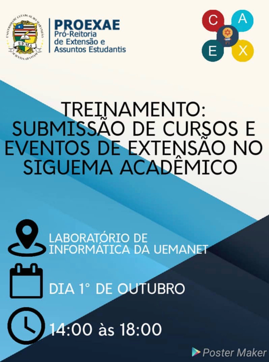 A Universidade Estadual do Maranhão (UEMA) por meio da Coordenação de Assuntos Extracurriculares da Pró-Reitoria de Extensão e Assuntos Estudantis promove o Treinamento: Submissão de Cursos e Eventos de Extensão no Siguema Acadêmico.