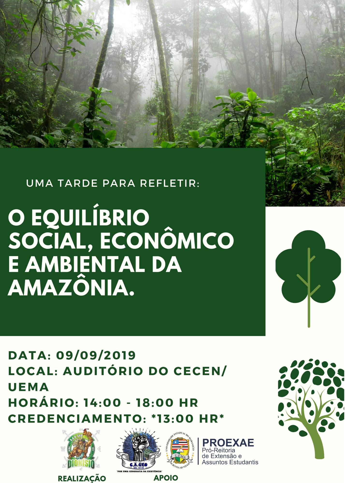 A Universidade Estadual do Maranhão (UEMA) por meio da Associação Atlética Acadêmica – Dionísio e discentes do curso de Geografia UEMA, promove o evento   “ Uma tarde para refletir: o equilíbrio social, econômico e ambiental da Amazônia”. O objetivo é ampliar as discussões a respeito da Amazônia e conscientizar as pessoas sobre a importância da maior floresta tropical do mundo e da sua biodiversidade para o planeta.