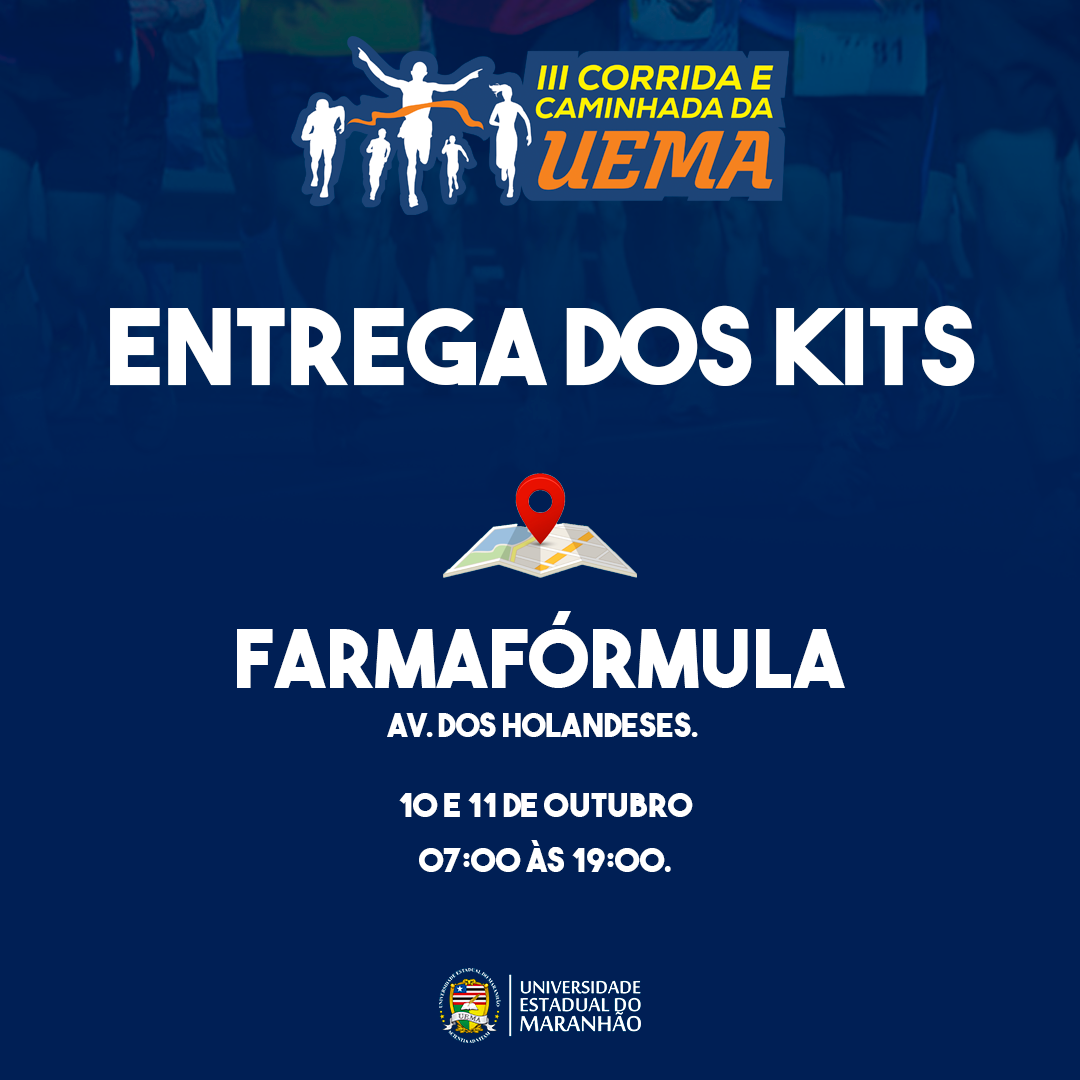 Nos dias 10 e 11 de outubro, serão entregues os kits dos participantes da III Corrida e Caminha da UEMA, na Farma Fórmula, localizada na Avenida dos Holandeses.