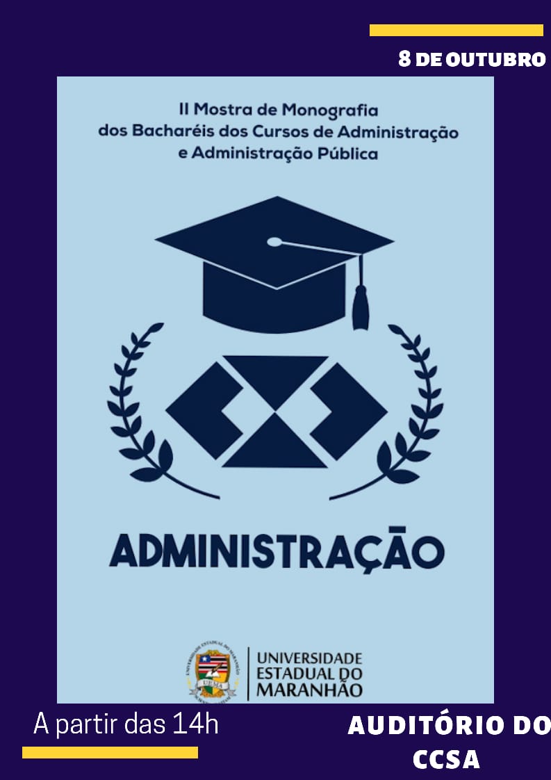 O Curso de Administração da Universidade Estadual do Maranhão (UEMA) realizará, dia 8 de outubro, no auditório do CCSA, a II Mostra de Monografia, com o objetivo de compartilhar e divulgar os trabalhos de conclusão de curso elaborados pelos bacharéis dos Cursos de Administração e Administração Pública.