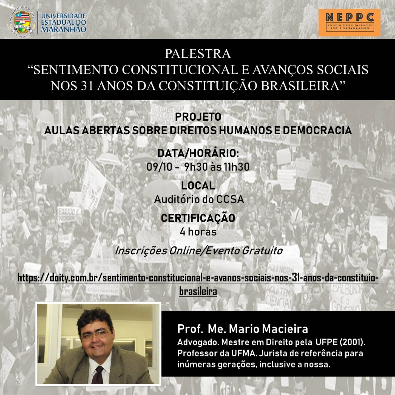 O Núcleo de Estudos em Processo Penal e Contemporaneidade (NEPPEC/UEMA), por meio do projeto de extensão “Aulas Abertas sobre Direitos Humanos e Democracia”, promove, dia 9 de outubro, no auditório do CCSA, a palestra “Sentimento Constitucional e Avanços Sociais nos 31 anos da Constituição Brasileira”.