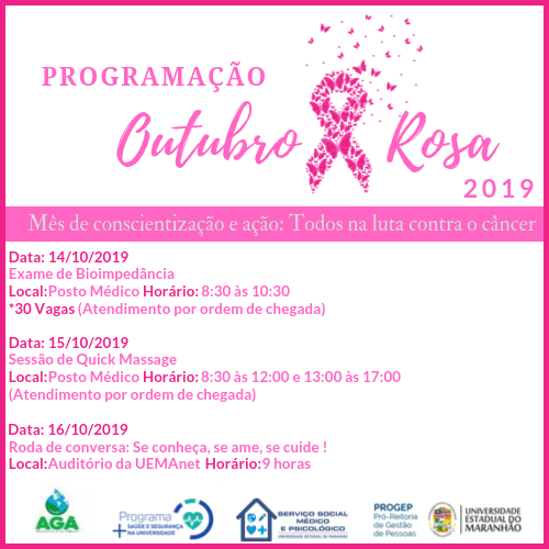 A Pró-Reitoria de Gestão de Pessoas da Universidade Estadual do Maranhão (PROGEP/UEMA), por meio da Coordenadoria de Qualidade de Vida (CQV), promove este mês várias ações em alusão à campanha de prevenção do câncer de mama.