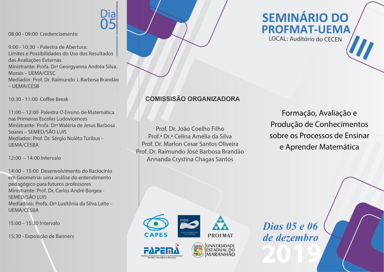 O Mestrado Profissional em Matemática (PROFMAT-UEMA) realizará o III Seminário de Matemática, dias 5 e 6 de dezembro, no auditório do CECEN.
