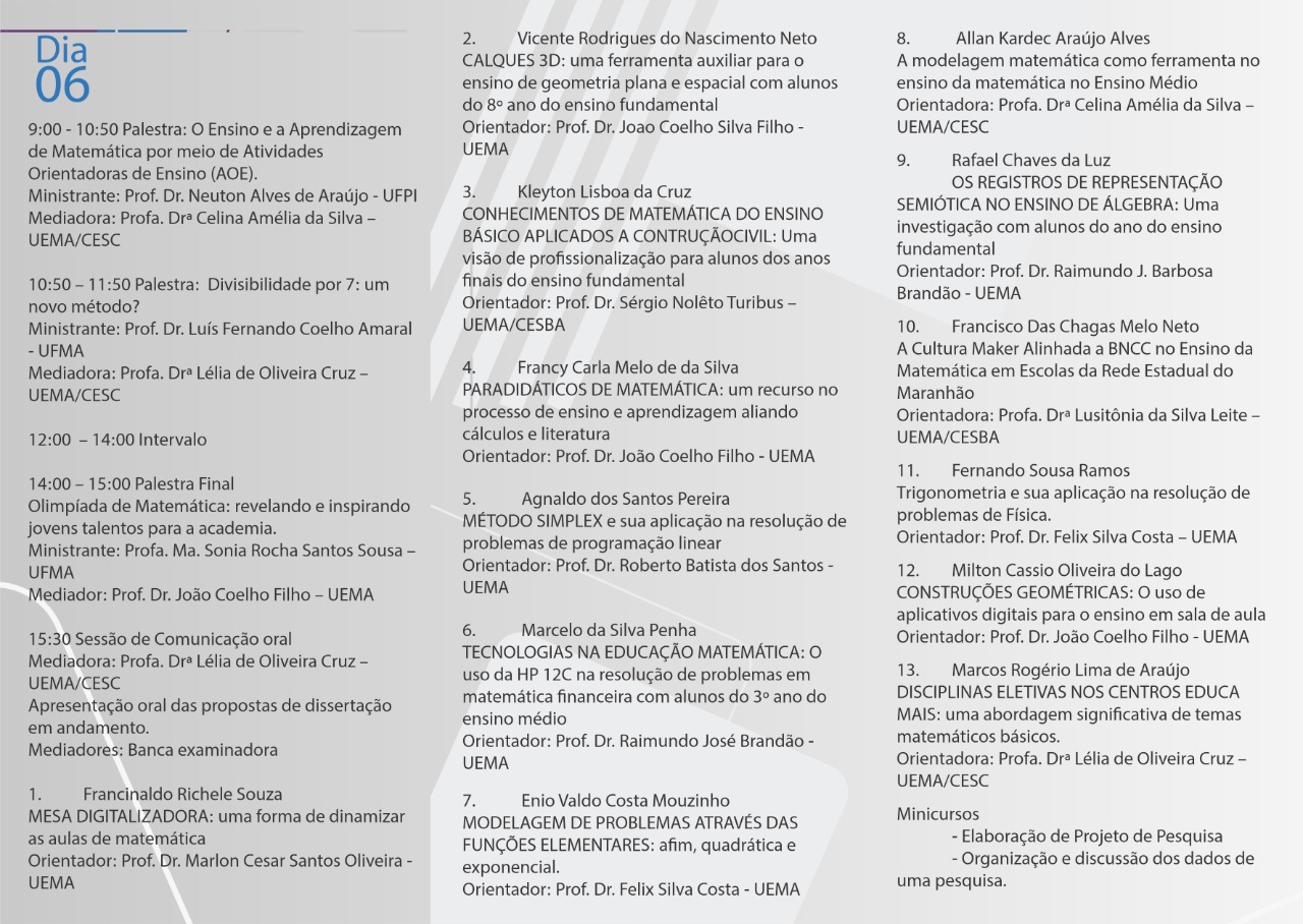 Durante o evento, haverá apresentação de trabalhos de pesquisa dos alunos em fase de elaboração de dissertação, além de palestras dos professores, dos pesquisadores e dos mestres egressos do PROFMAT-UEMA