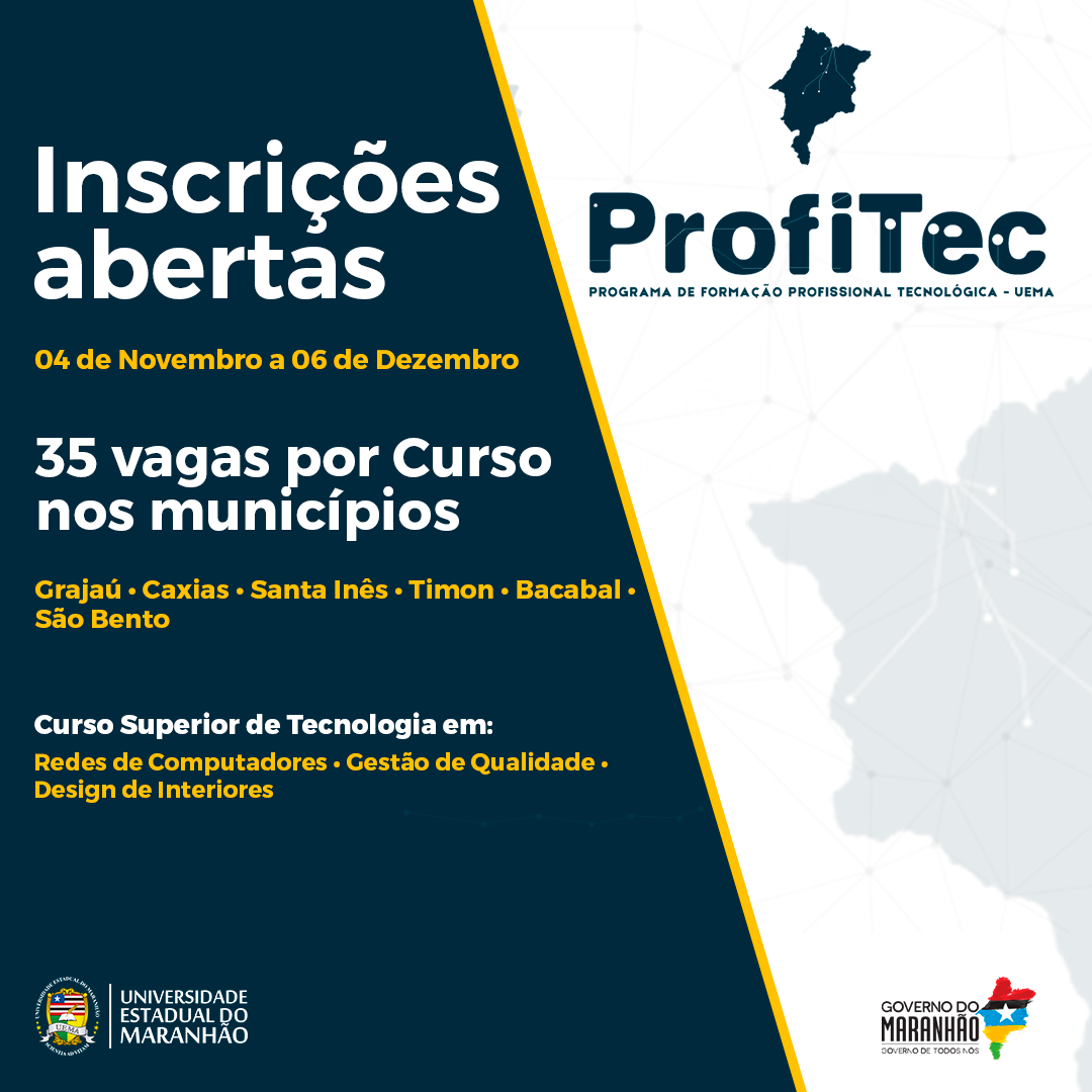 As vagas são para os Cursos Superiores de Tecnologia em Redes de Computadores, Tecnologia em Gestão de Qualidade e Tecnologia em Design de Interiores e serão ofertadas nos municípios de Grajaú, Caxias, Santa Inês, Timon, Bacabal e São Bento.