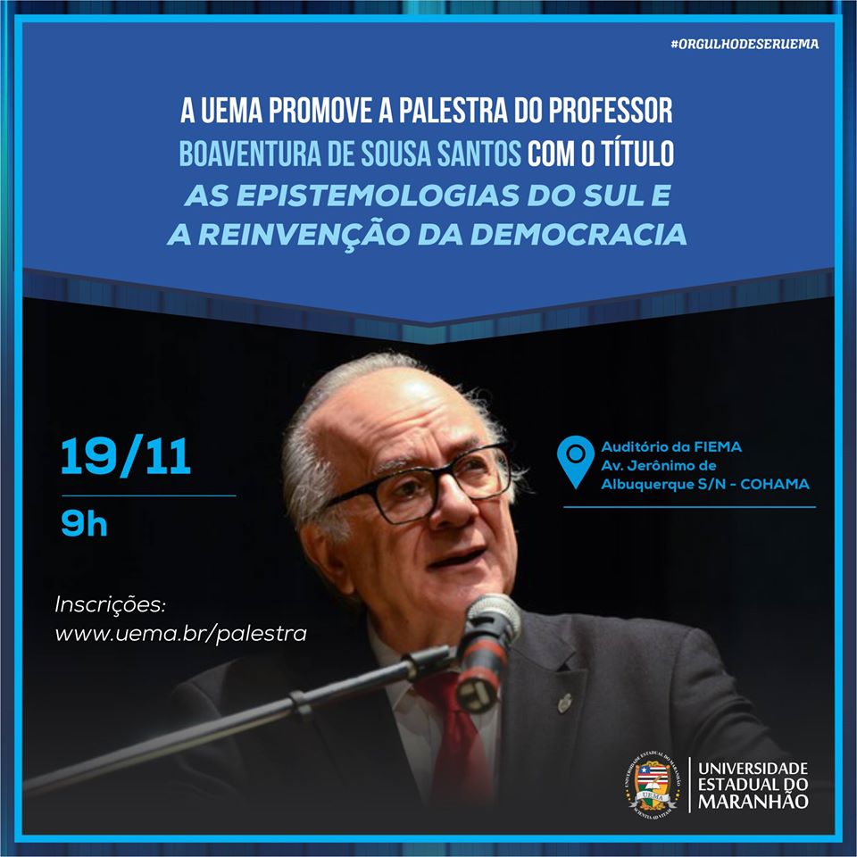 75442950_2636575163067228_7099810042433503232_oAinda dá tempo de  participar da palestra “Epistemologias do Sul e a Reinvenção da Democracia”, com o renomado pesquisador, poeta, escritor e sociólogo português Boaventura de Sousa Santos. Uma realização da Universidade Estadual do Maranhão (UEMA), que acontecerá dia 19 de novembro às 9h, no auditório da FIEMA.