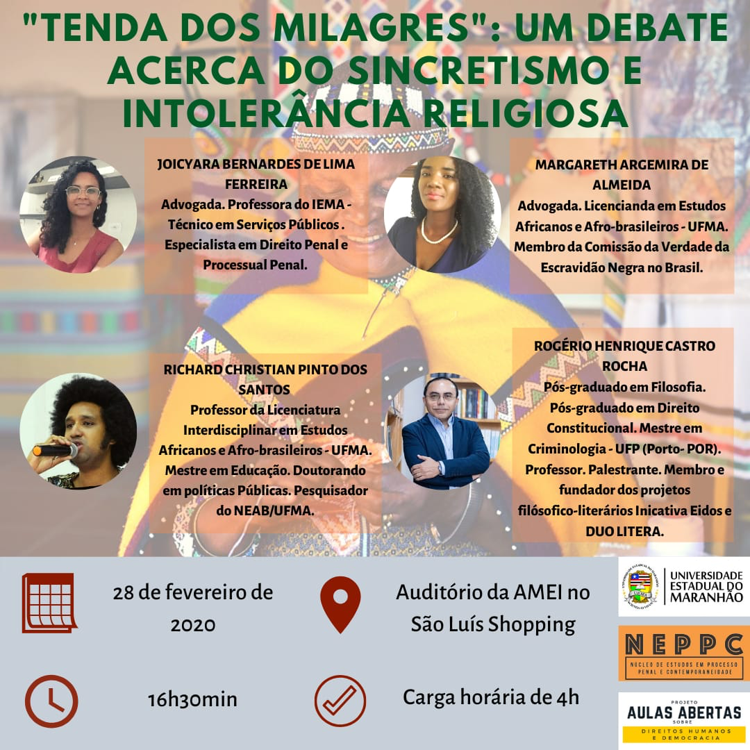 O Projeto de Extensão “Aulas abertas sobre Direitos Humanos e Democracia”, vinculado ao Núcleo de Estudos em Processo Penal e Contemporaneidade (NEPPC/UEMA), promove o evento “Tenda dos Milagres: um debate acerca do sincretismo e intolerância religiosa “, dia 28 de fevereiro, às 16h30, no Auditório da AMEI (São Luís Shopping).