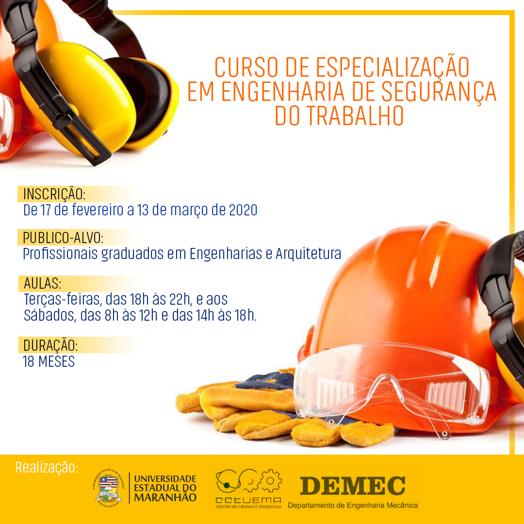 A Pró-Reitoria de Pesquisa e Pós-Graduação da Universidade Estadual do Maranhão (PPG/UEMA) informa que estão abertas, até o dia 13 de março, as inscrições para a seleção ao Curso de Especialização em Engenharia de Segurança do Trabalho (CEEST) do Centro de Ciências Tecnológicas (CCT/UEMA).