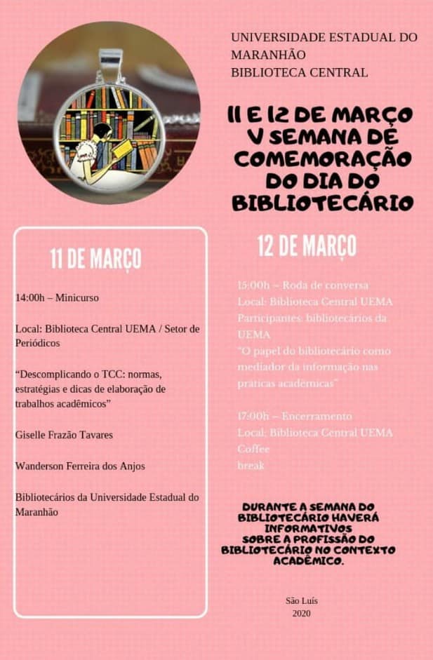 A Universidade Estadual do Maranhão (UEMA), por meio da Biblioteca Central, realiza, dias 11 e 12 de março, a V Semana de Comemoração ao Dia do Bibliotecário.