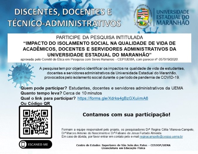 O Campus São João dos Patos realiza a pesquisa “Impacto do isolamento social na qualidade de vida de acadêmicos, docentes e servidores administrativos da Universidade Estadual do Maranhão”.