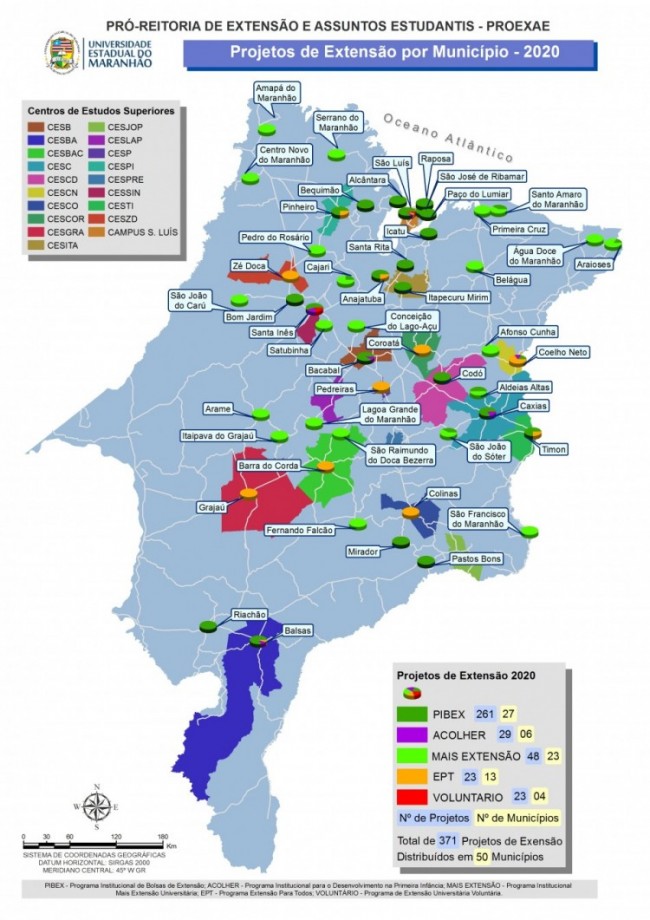 As ações dos 371 projetos de extensão foram desenvolvidas em 50 municípios maranhenses. Os municípios com maior número de projetos sendo executados foram São Luís (128 projetos), Caxias (90), Bacabal (20), Balsas (17) e Santo Amaro do Maranhão (10).