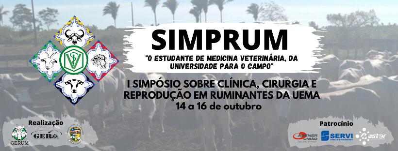 A Universidade Estadual do Maranhão (UEMA), por meio do Grupo de Estudos em Reprodução Animal (GERA) e do Grupo de Estudo em Clínica de Ruminantes (GERUM), realizará o I Simpósio sobre Clínica, Cirurgia e Reprodução de Ruminantes da Instituição (SIMPRUM), com o tema “O estudante de Medicina Veterinária, da Universidade para o campo”. O evento acontecerá de forma online, por meio do canal da UEMANET na plataforma do YouTube, nos dias 14, 15 e 16 de outubro de 2020.