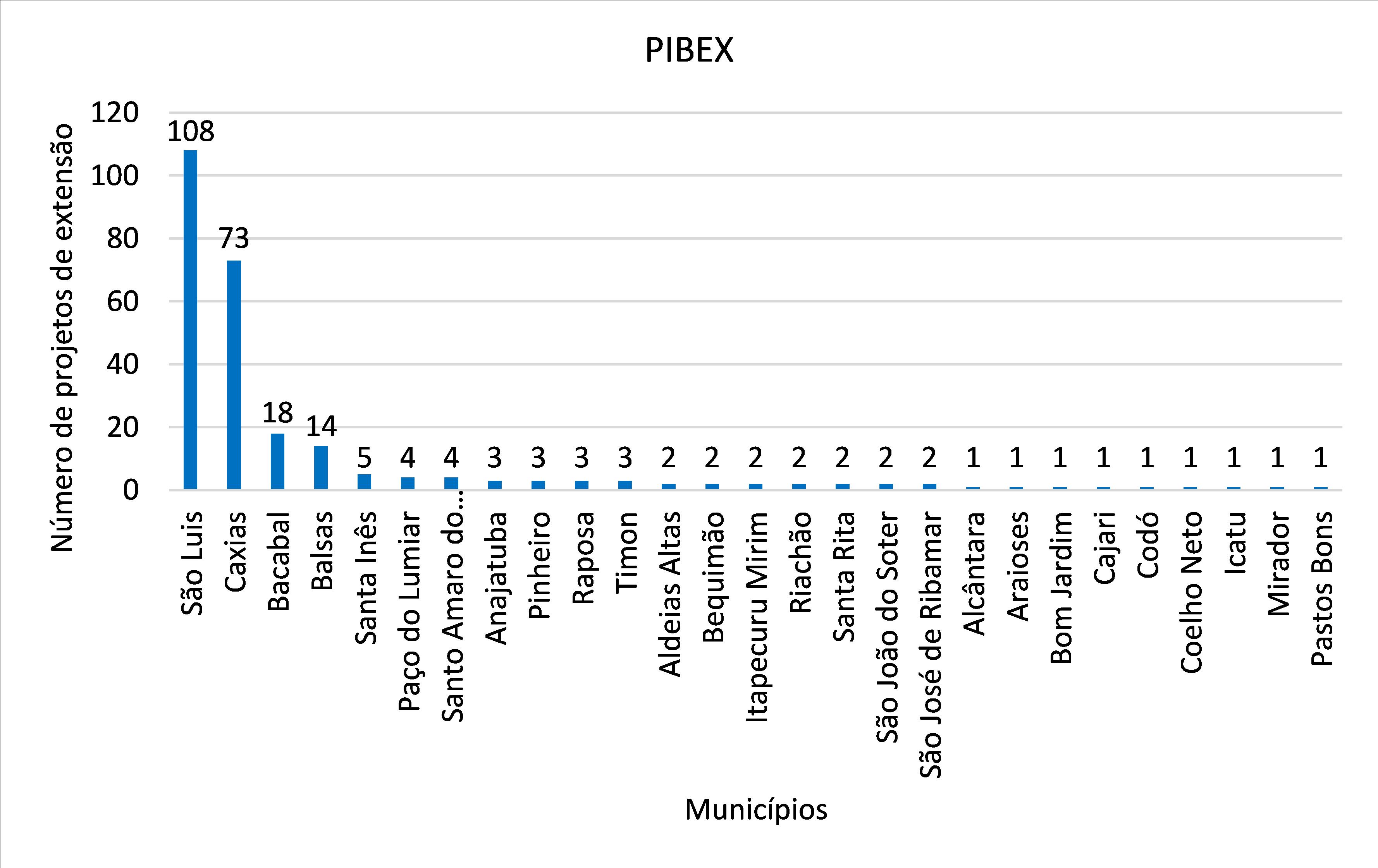 No exercício 2019-2020 foram desenvolvidos 261 projetos no Programa PIBEX, sendo 250 projetos com concessão de bolsa de extensão e 11 de forma voluntária. Os projetos foram desenvolvidos por equipes formadas por docentes e discentes da UEMA, abrangendo 27 municípios maranhenses conforme o gráfico abaixo.