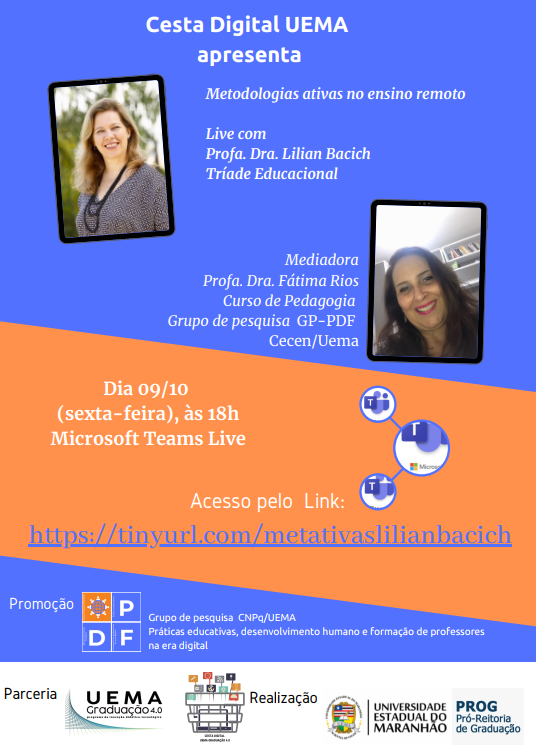 A Universidade Estadual do Maranhão (UEMA), por meio da ação formativa “Cesta Digital”, em parceria com o Programa Graduação 4.0 da Pró-Reitoria de Graduação, oferece aos professores da UEMA, alunos das licenciaturas e a comunidade em geral a Palestra “Metodologias Ativas no ensino remoto”, promovida pelo Grupo de pesquisa CNPq/UEMA “Práticas educativas, desenvolvimento humano e formação de professores na era digital (GP-PDF)”, coordenado pelas professoras Fátima Rios, Sandra Passinho, Júlia Constança e Heloisa Varão (CECEN/UEMA).