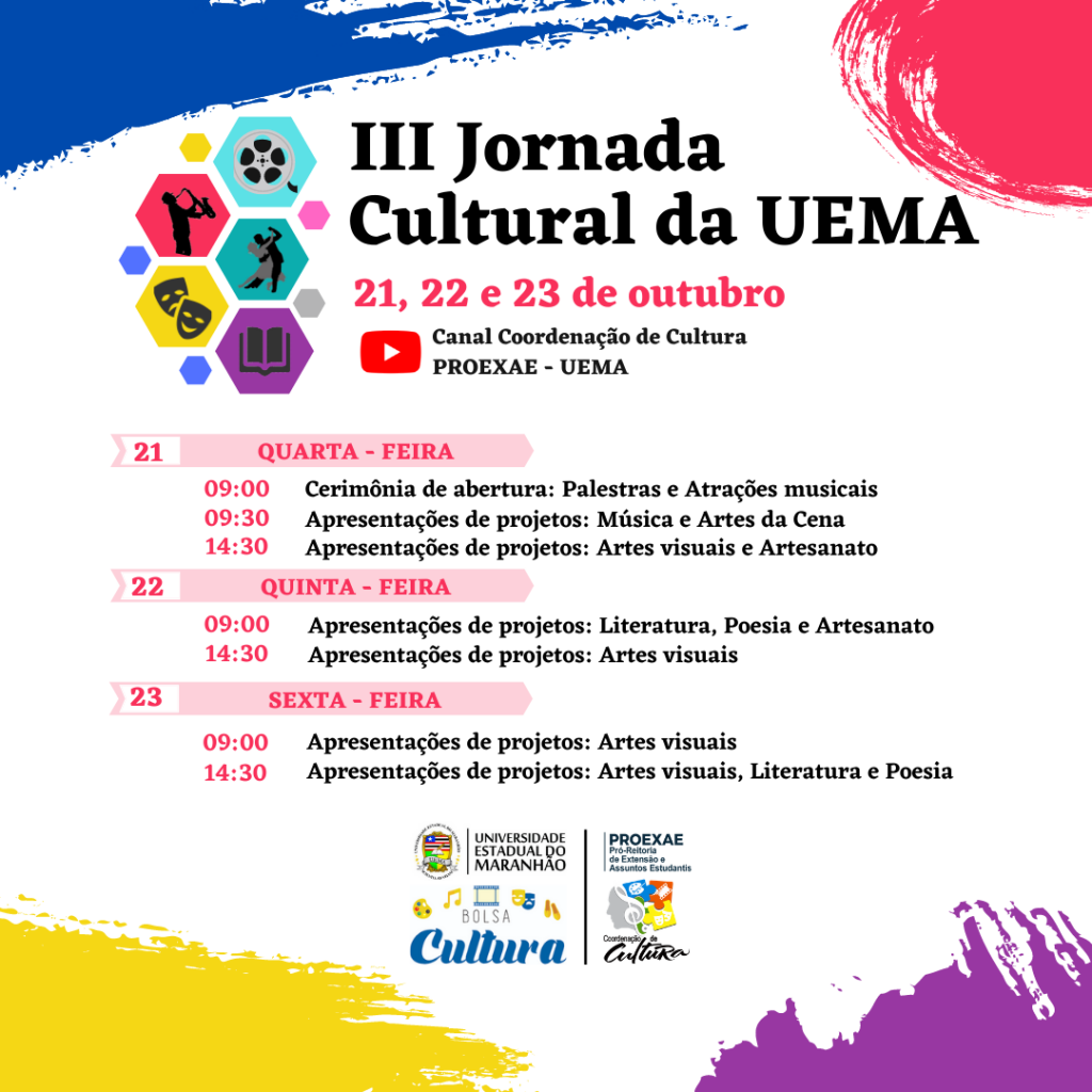A Universidade Estadual do Maranhão, por meio da Coordenação de Cultura da PROEXAE, promoverá a III Jornada Cultural. O evento será aberto a toda comunidade acadêmica e tem o propósito de apresentar os resultados obtidos durante o período de realização e pesquisa dos projetos da Bolsa Cultura.