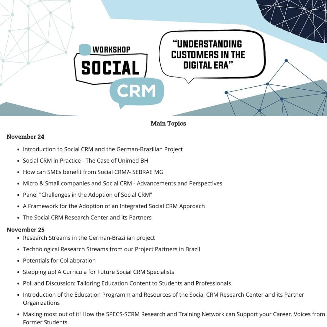 O workshop é on-line e tem como objetivo divulgar as pesquisas e atividades do projeto “Social Customer Relationship Management as Specialization Subject in Brazilian Universities”, realizado em parceria com a Universidade de Leipzig (Alemanha).