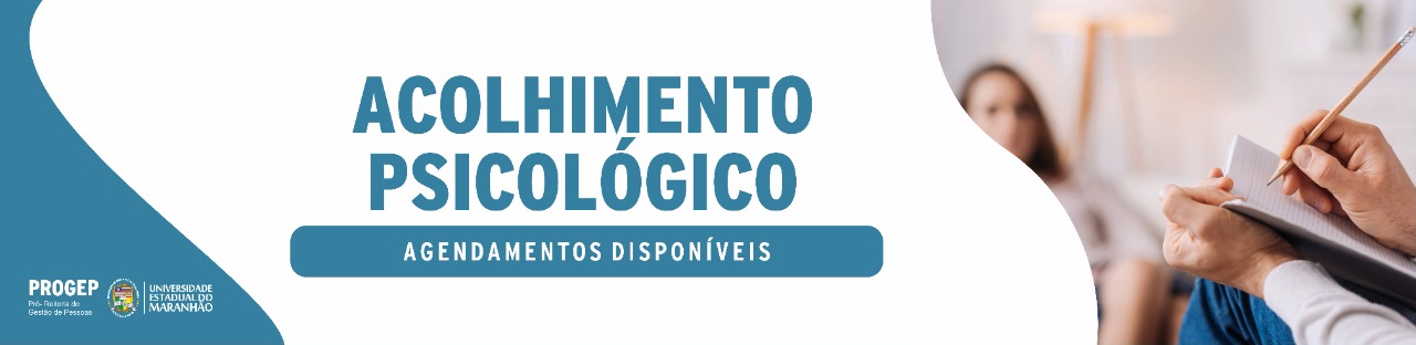 A Pró-Reitoria de Gestão de Pessoas (PROGEP/UEMA), por meio do Serviço de Orientação Psicopedagógica (SOPP/UEMA), informa aos Senhores Pró-Reitores, Diretores de Centros, Diretores de Cursos, Chefes de Departamento e chefias das demais Unidades da Universidade Estadual do Maranhão, que o Sistema de Agendamento Psicológico voltou a normalidade, podendo a partir dessa data, ser usado para a realização de agendamentos, no endereço: www.agendamento.uema.br.