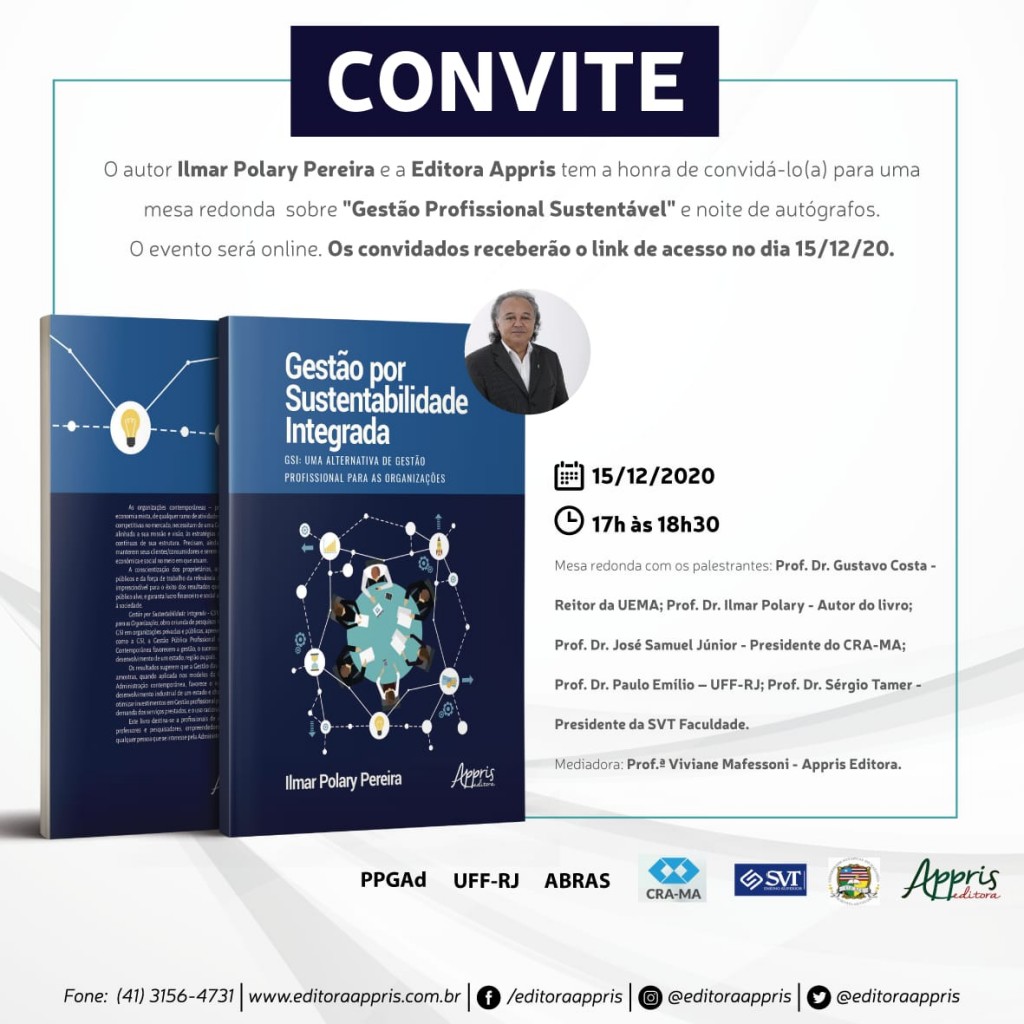 O Prof. Dr. Ilmar Polary Pereira da Universidade Estadual do Maranhão lança, nesta terça (15/12) às 17h, o livro “Gestão por Sustentabilidade Integrada – GSI: Uma alternativa de Gestão Profissional para as Organizações” pelo link https://zoom.us/j/96784977103. Na ocasião, será realizada a mesa redonda “Gestão Profissional Sustentável”.