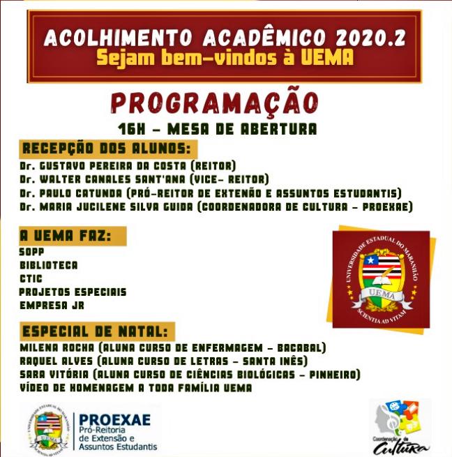 A Universidade Estadual do Maranhão (UEMA), por meio da Pró-Reitoria de Extensão e Assuntos Estudantis (PROEXAE), promove, dia 15 de dezembro, o Acolhimento Acadêmico do segundo semestre de 2020.