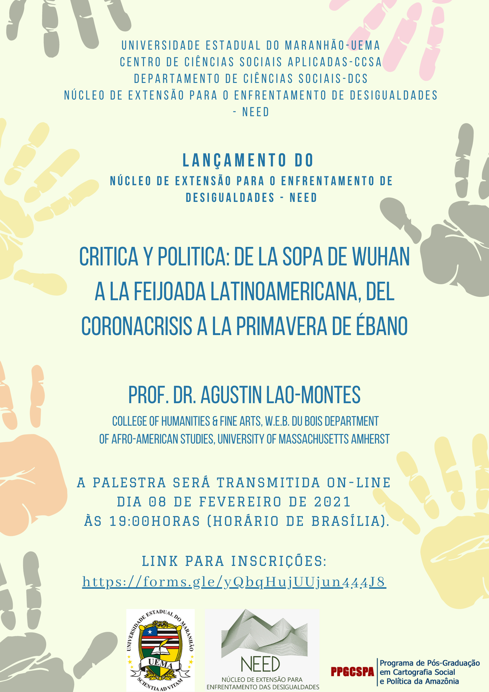 Na ocasião, ocorrerá a palestra “Critica y Politica: De La Sopa de Wuhan a la Feijoada Latinoamericana, Del Coronacrisis a la Primavera de Ébano”, que será ministrada pelo professor Dr. Agustin Lao-Montes, do College of Humanities & Fine Arts, W.E.B. Du Bois Department of Afro-American Studies, University of Massachusetts Amherst.