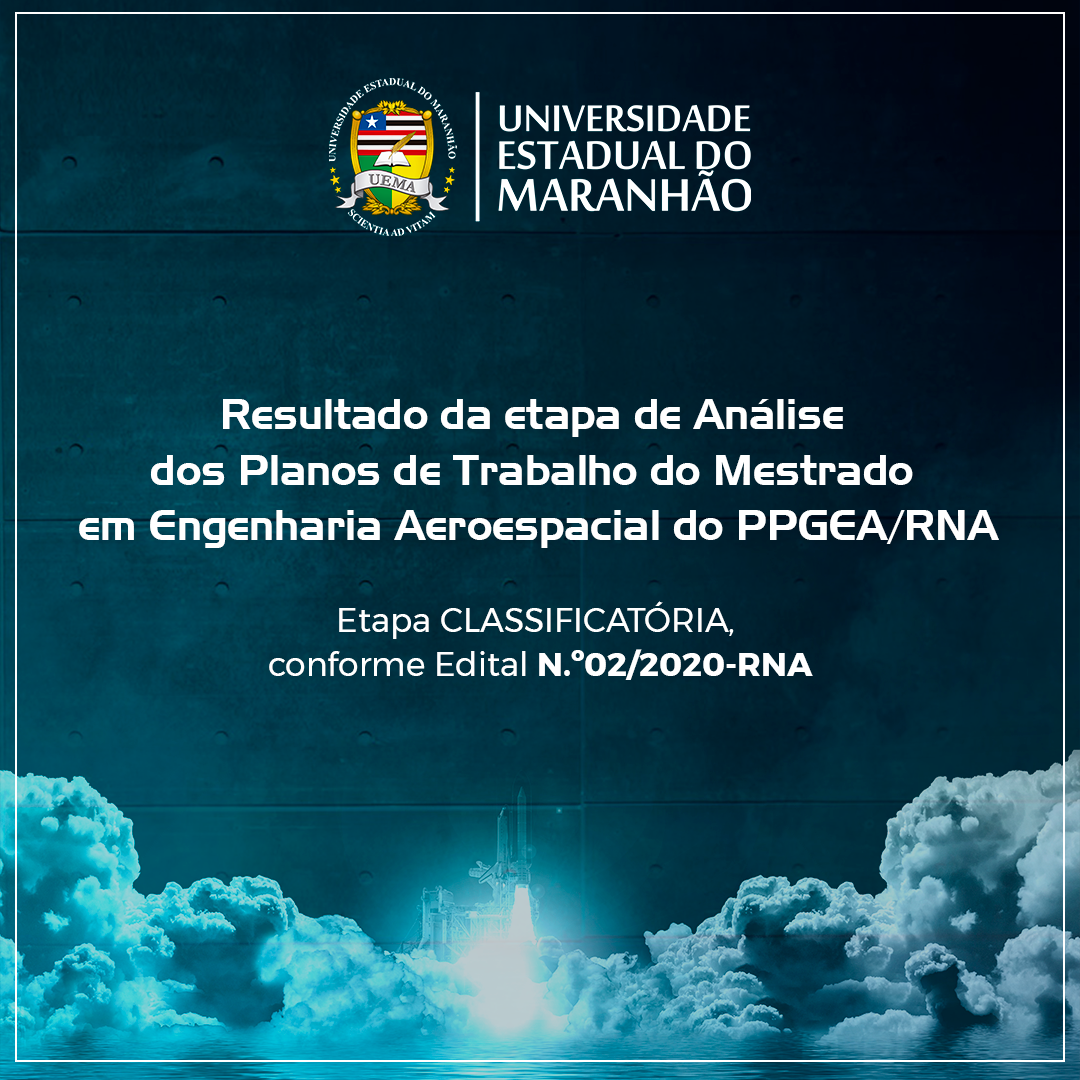 A Universidade Estadual do Maranhão, por meio da Comissão de Seleção do Processo Seletivo 2021 da RNA, divulga o resultado da etapa de Análise dos Planos de Trabalho do Mestrado em Engenharia Aeroespacial da Rede Nordeste Aeroespacial (PPGEA/RNA).Essa etapa é CLASSIFICATÓRIA, conforme Edital N.º02/2020-RNA.