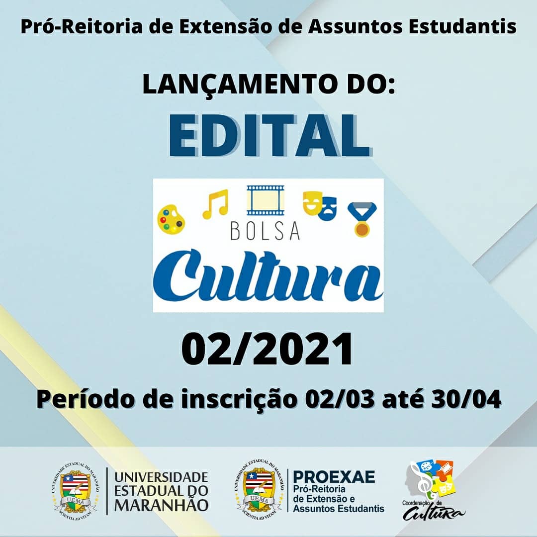 Bolsa Cultura – é uma Bolsa de Extensão do Programa Campus Cultural – UEMA que tem por objetivo promover ações, registros artísticos e culturais de forma a integrar saberes, habilidades e expressões literárias, musicais, performáticas, visuais, desportivas e outras, na relação universidade e sociedade.
