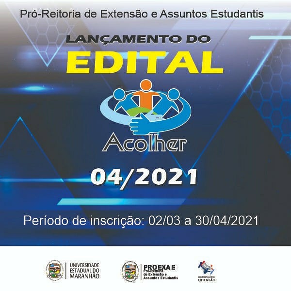A Universidade Estadual do Maranhão (UEMA) está com inscrições abertas, até 30 de abril, para seleção de projetos e bolsistas dos Programas Institucionais Bolsa Cultura e Bolsa de Extensão (PIBEX) e Programa Institucional para o Desenvolvimento na Primeira Infância-ACOLHER/2021.