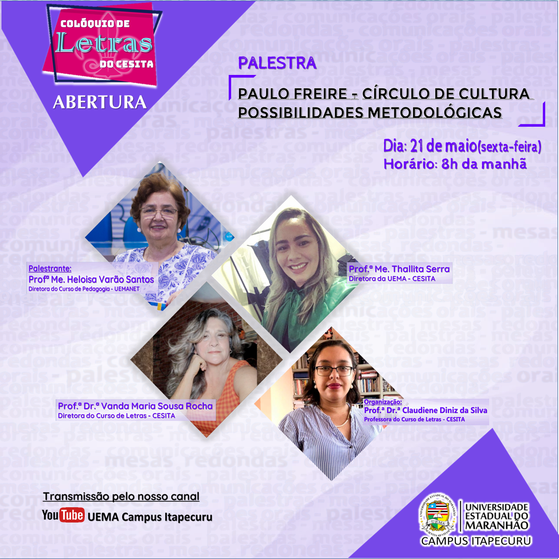 A palestra de abertura abordará o tema “Paulo Freire: Círculo de cultura e possibilidades metodológicas” e será ministrada pela Professora Heloisa Varão (UFPB).