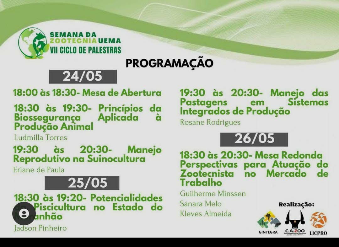 Na programação constam palestras sobre biossegurança aplicada à produção animal, manejo das pastagens em sistemas integrados de reprodução, manejo reprodutivo na suinocultura, potencialidades da piscicultura no Maranhão; além de mesa redonda sobre perspectiva de atuação do zootecnista no mercado de trabalho.