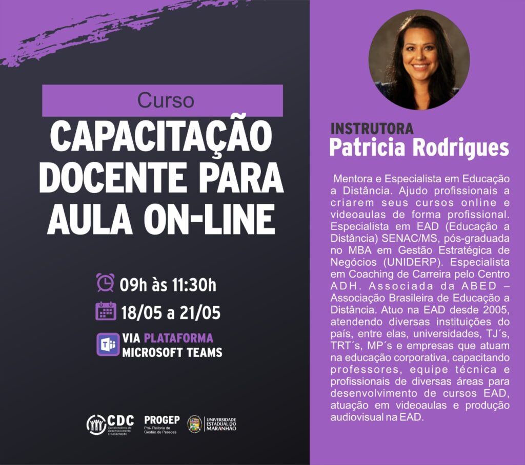 “Capacitação Docente para Aula On-line”, terá como instrutora a mentora e especialista em educação a distância, Patrícia Rodrigues. O curso será ofertado em ambiente online, via plataforma virtual Microsoft Teams e terá carga horária de 20h.