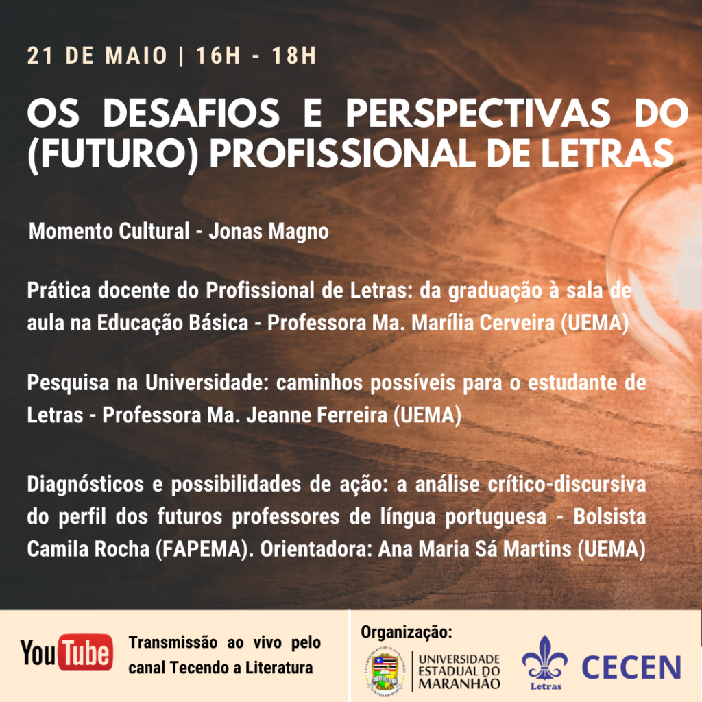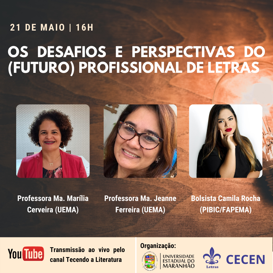 Em comemoração ao Dia do Profissional de Letras, no dia 21 de Maio, às 16 horas, a Direção dos Cursos de Letras da Universidade Estadual do Maranhão (UEMA), Campus Paulo VI, realizará uma mesa-redonda intitulada “Os desafios e perspectivas do (futuro) profissional de Letras”.