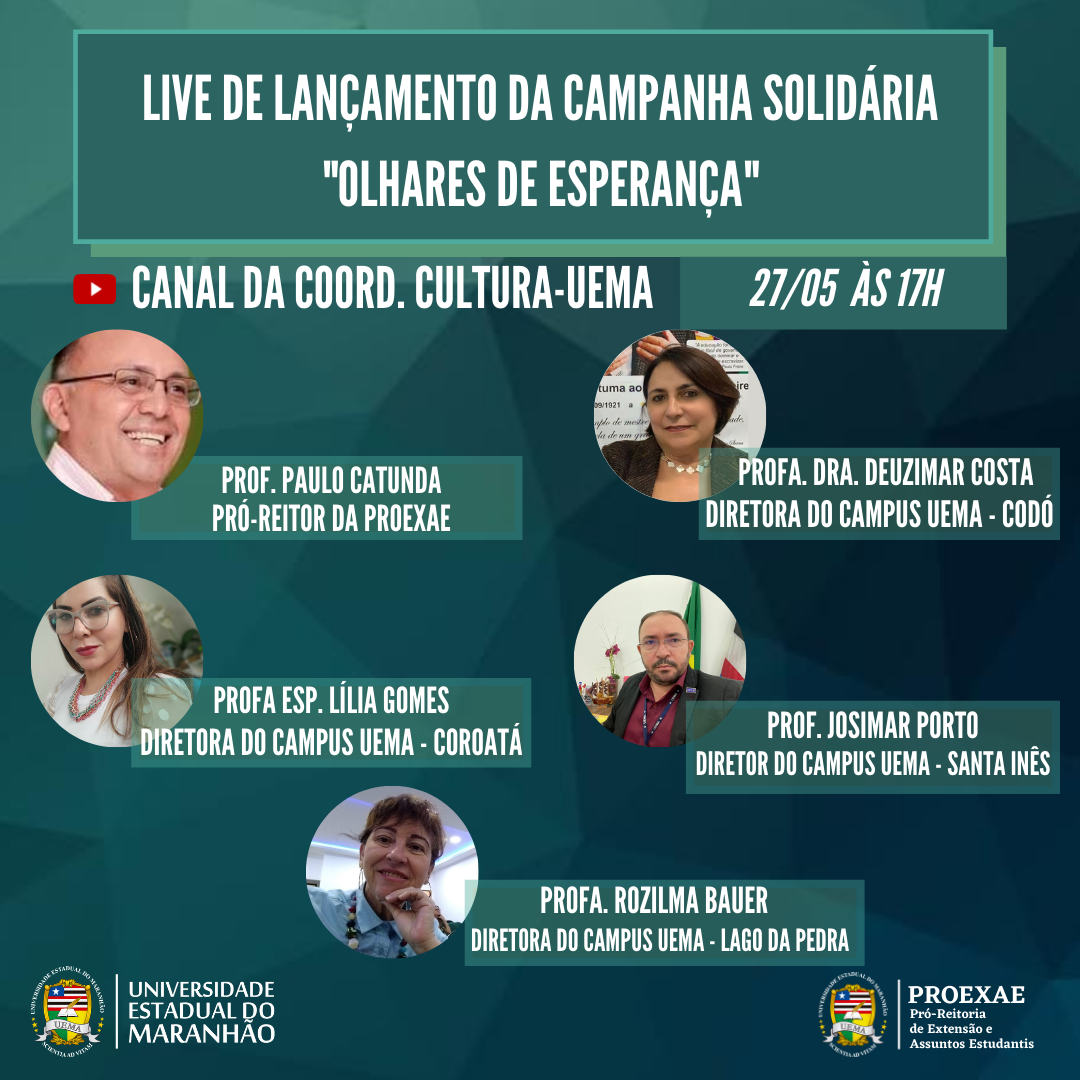 A Universidade Estadual do Maranhão (UEMA), por meio da Pró-Reitoria de Extensão e Assuntos Estudantis (PROEXAE), irá realizar, dia 27 de maio, às 17h, o evento de lançamento da Campanha Solidária “Olhares de Esperança”.