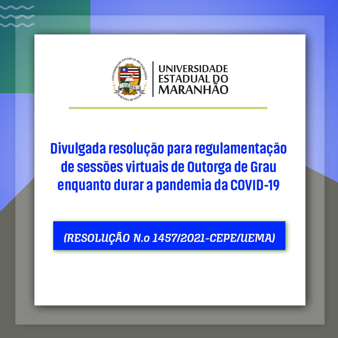 A Universidade Estadual do Maranhão (UEMA), por meio do Conselho de Ensino, Pesquisa e Extensão (CEPE), publicou, no dia 28 de maio, a Resolução N.o 1457/2021-CEPE/UEMA, que trata sobre a regulamentação de sessões virtuais de Outorga de Grau em todos os campi da IES enquanto durar a pandemia da COVID-19.