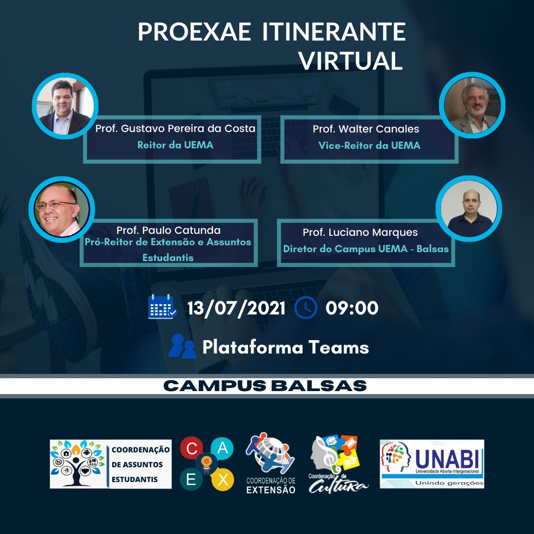 A Pró-Reitoria de Extensão e Assuntos Estudantis da Universidade Estadual do Maranhão(PROEXAE/UEMA) está chegando em todos os campi da IES por meio da PROEXAE ITINERANTE.
