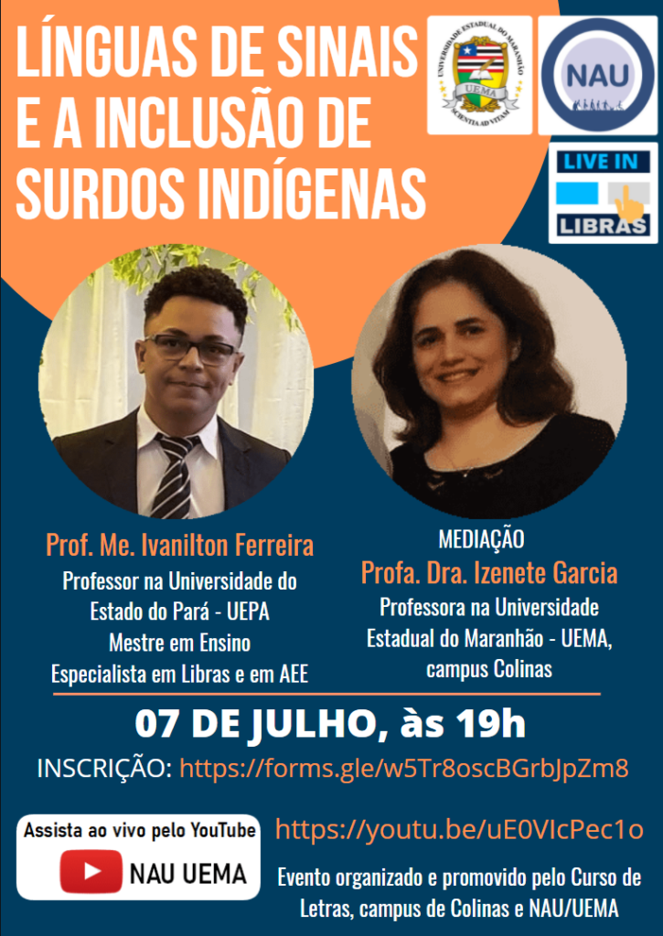 O Núcleo de Acessibilidade da Universidade Estadual do Maranhão (NAU/UEMA), em parceria com o Curso de Letras do campus de Colinas, realizarão uma live com o tema “Línguas de Sinais e a Inclusão de Surdos Indígenas “.