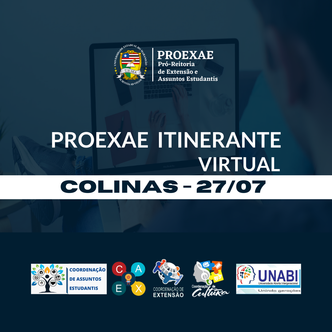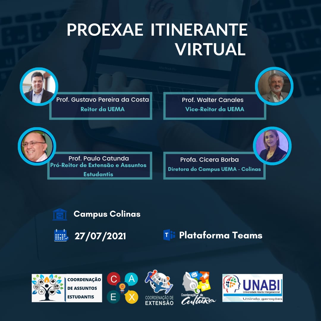 A Pró-Reitoria de Extensão e Assuntos Estudantis da Universidade Estadual do Maranhão (PROEXAE/UEMA) está chegando em todos os campi da IES por meio da PROEXAE ITINERANTE VIRTUAL.