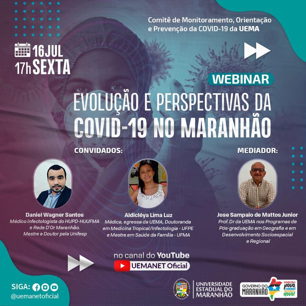 A Universidade Estadual do Maranhão (UEMA), por meio do Comitê de Monitoramento, Orientação e Prevenção da COVID-19, promove, nesta sexta(16), às 17h, o Webinar “Evolução e perspectivas da COVID-19 no Maranhão”.